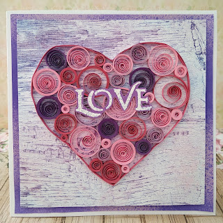 Dzień dobry moi drodzy! Teraz już zaprzeczać nie mogę. Nawet tak leniwa osoba jak ja w końcu wzięła się do nauki przed egzaminem. No i nagle jakoś czasu mniej na hobby niestety. Są jednak sprawy ważne i ważniejsze, a jak tu nic nie stworzyć z okazji nadchodzących walentynek? Dzisiaj prezentuję kartkę z sercem. Trochę w stylu clean&simple, prosta, ale (mam nadzieję) efektowna. Charakteru quillingowemu sercu dodaje zembossingowany napis "love" i arkusik od MintayPapers, a także fioletowa baza potraktowana mgiełką. Pracę posyłam na wyzwania: TUTAJ, TUTAJ i TUTAJ.